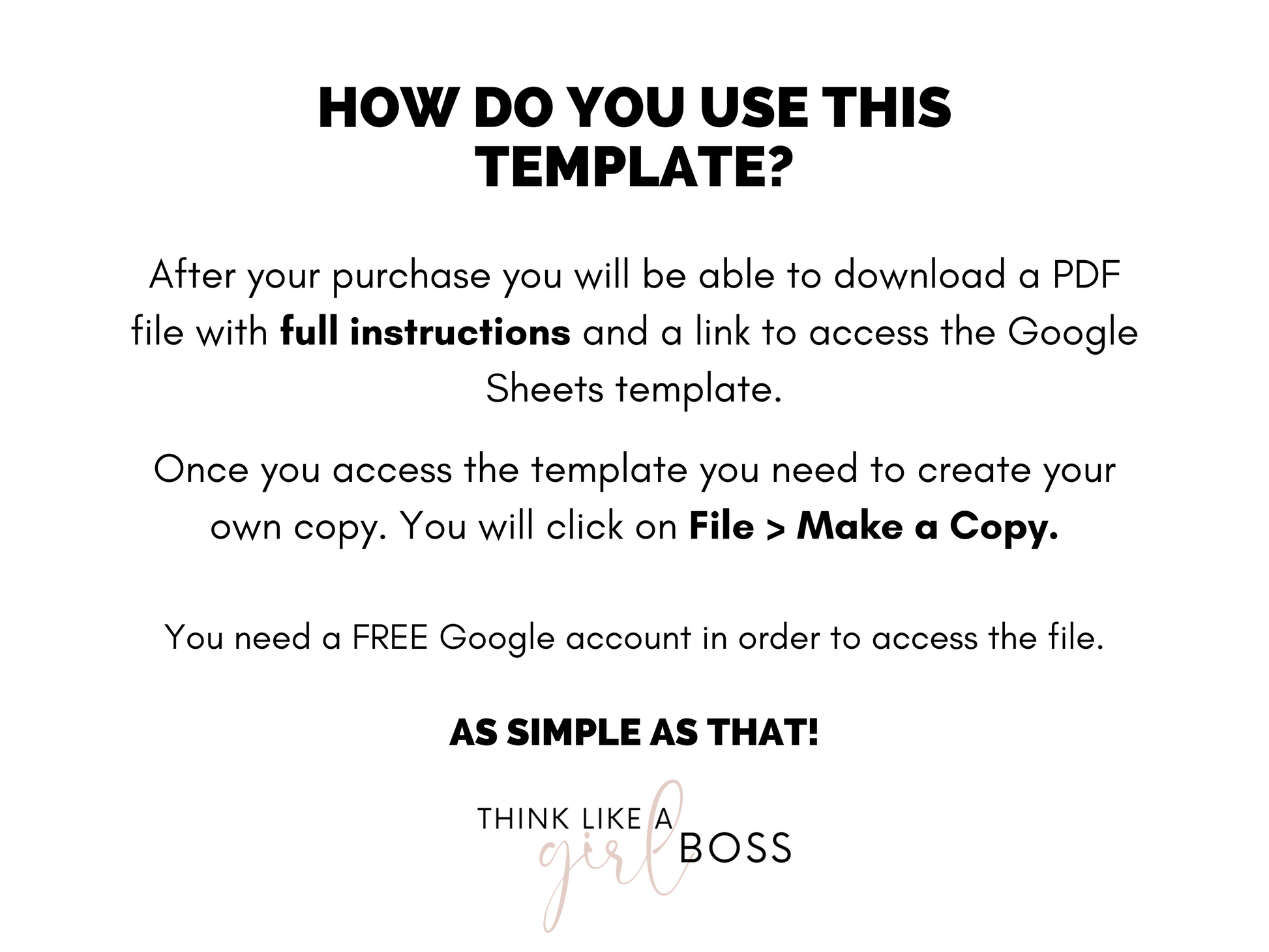 • Please note this template is NOT compatible with Excel, it can ONLY be used with Google Sheets.