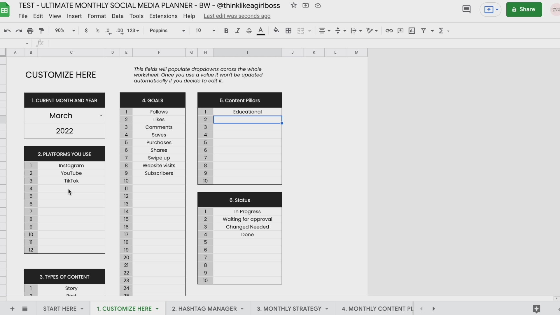 • Step 1: Customize your list of platforms, content pillars and hashtags.