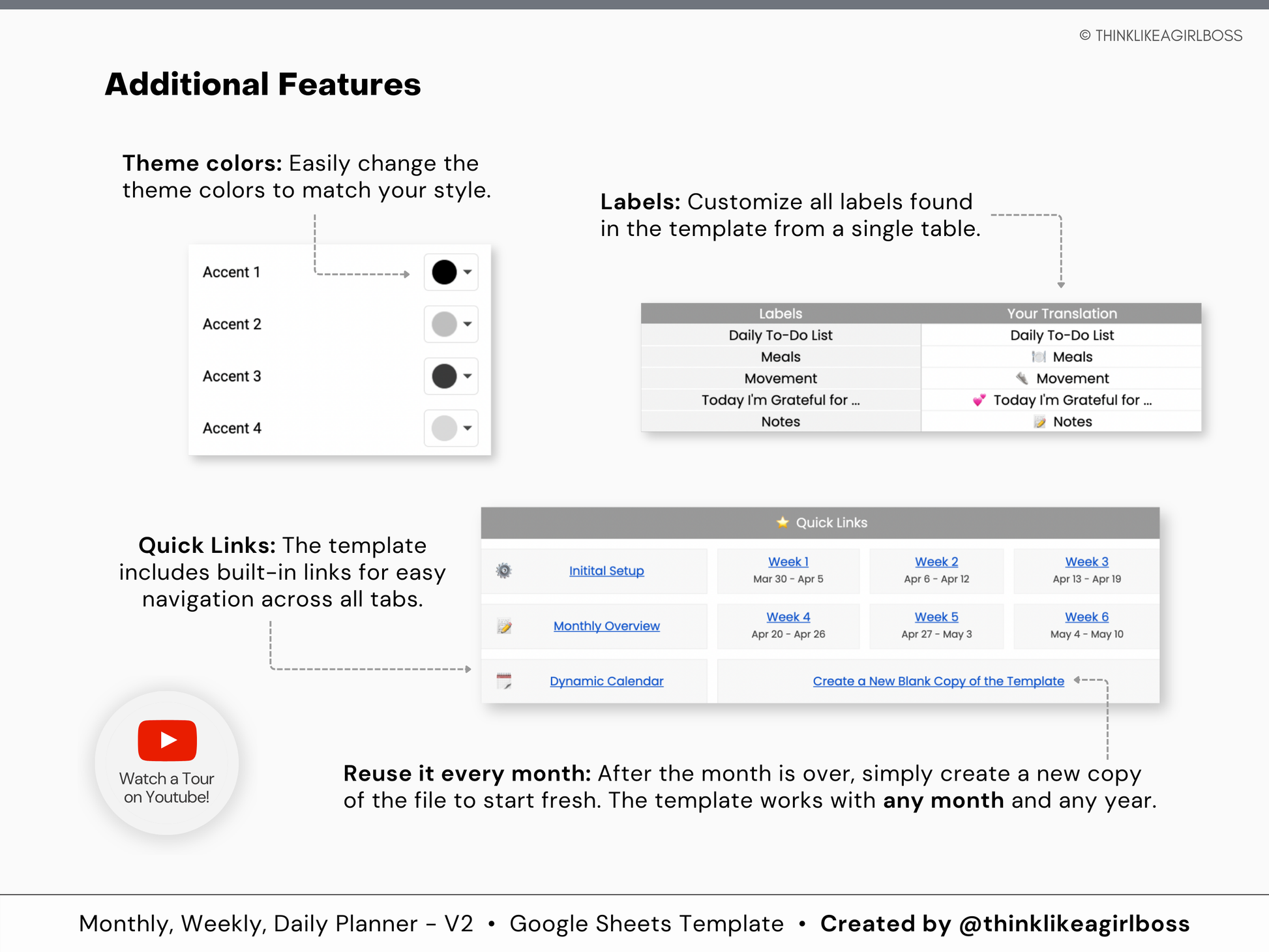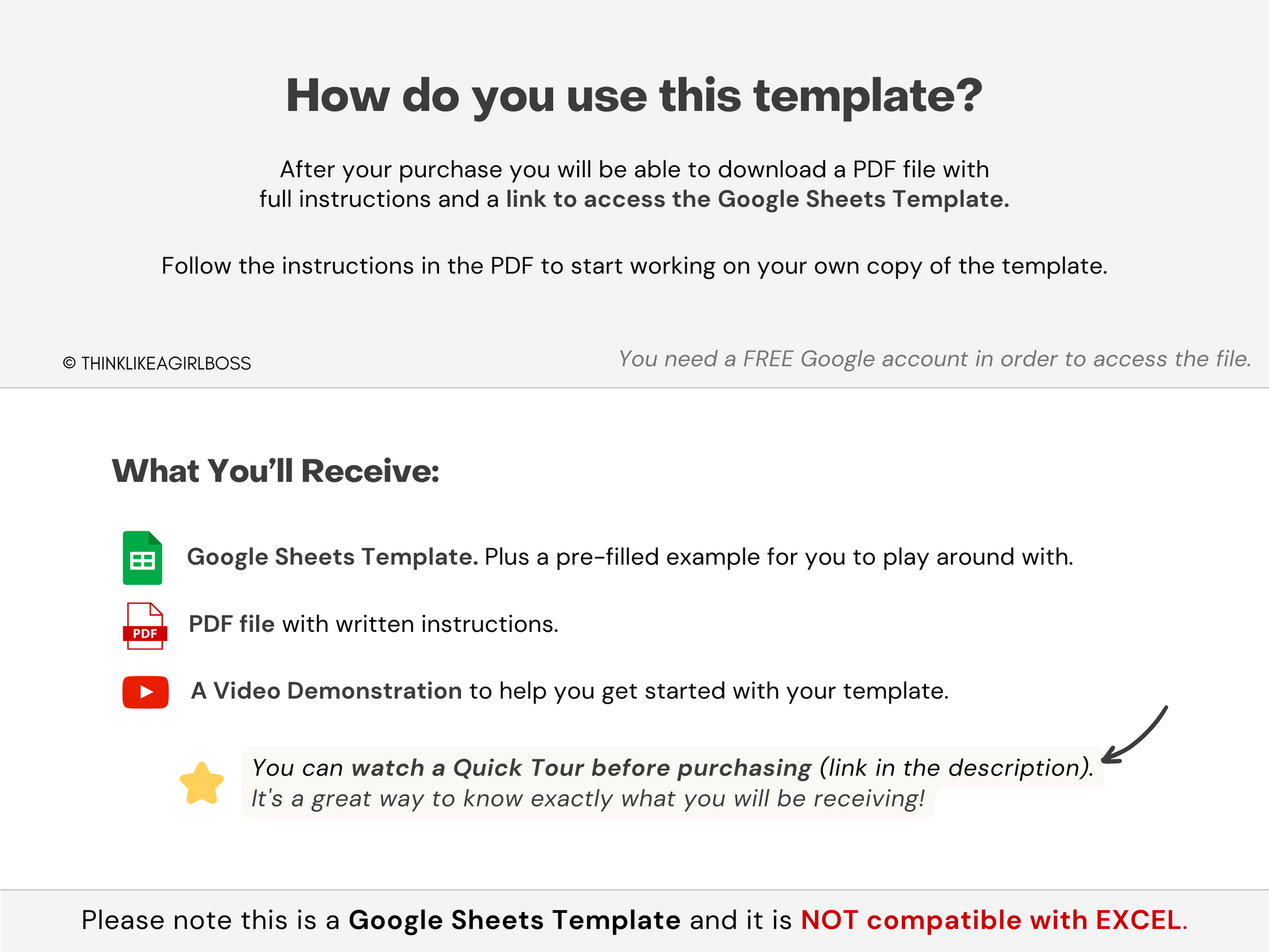 - Please note this template is NOT compatible with Excel, it can ONLY be used with Google Sheets.