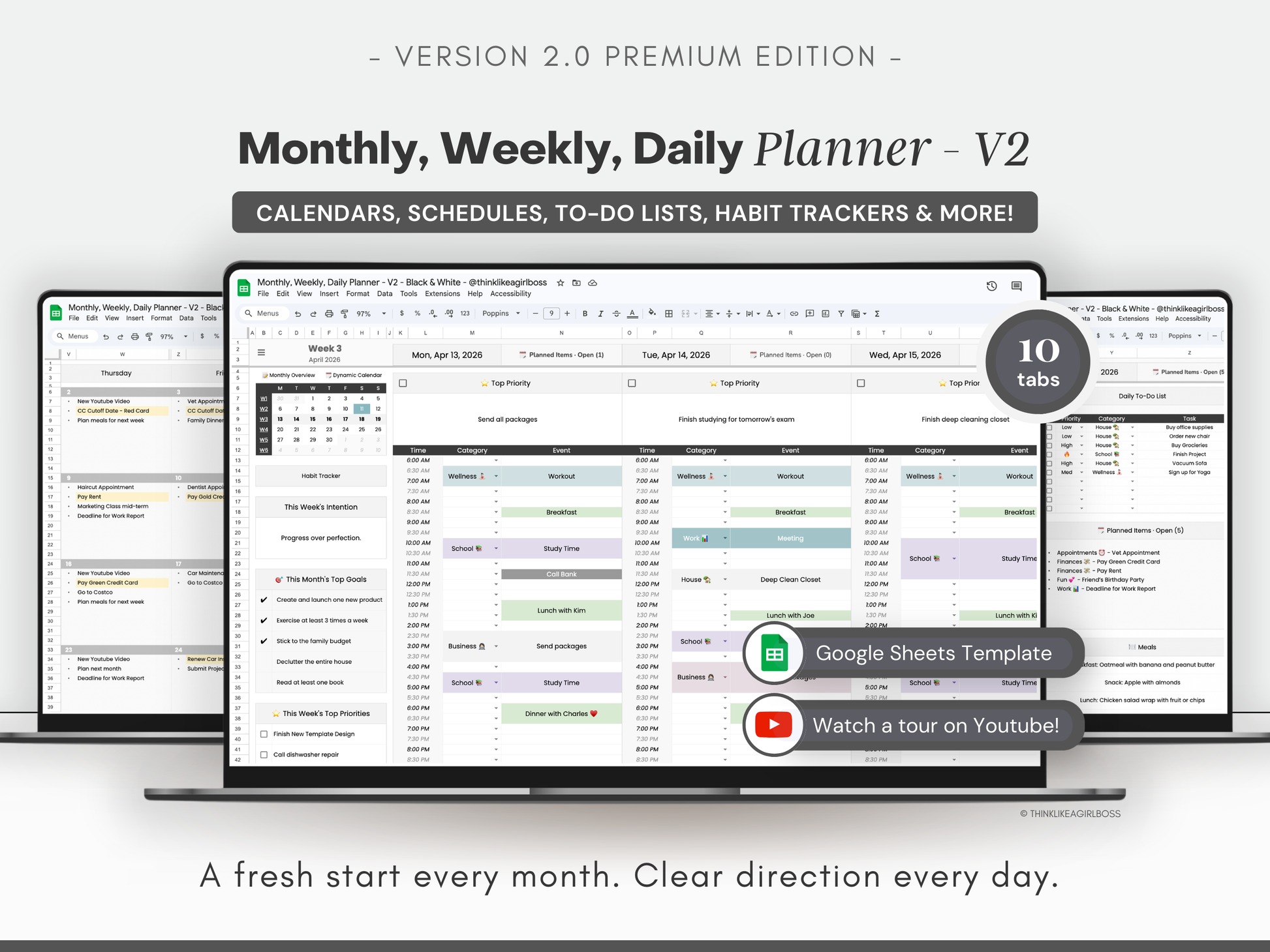 Fill out daily schedules, create to-do lists, plan meals and workouts, practice daily gratitude, and track habits.