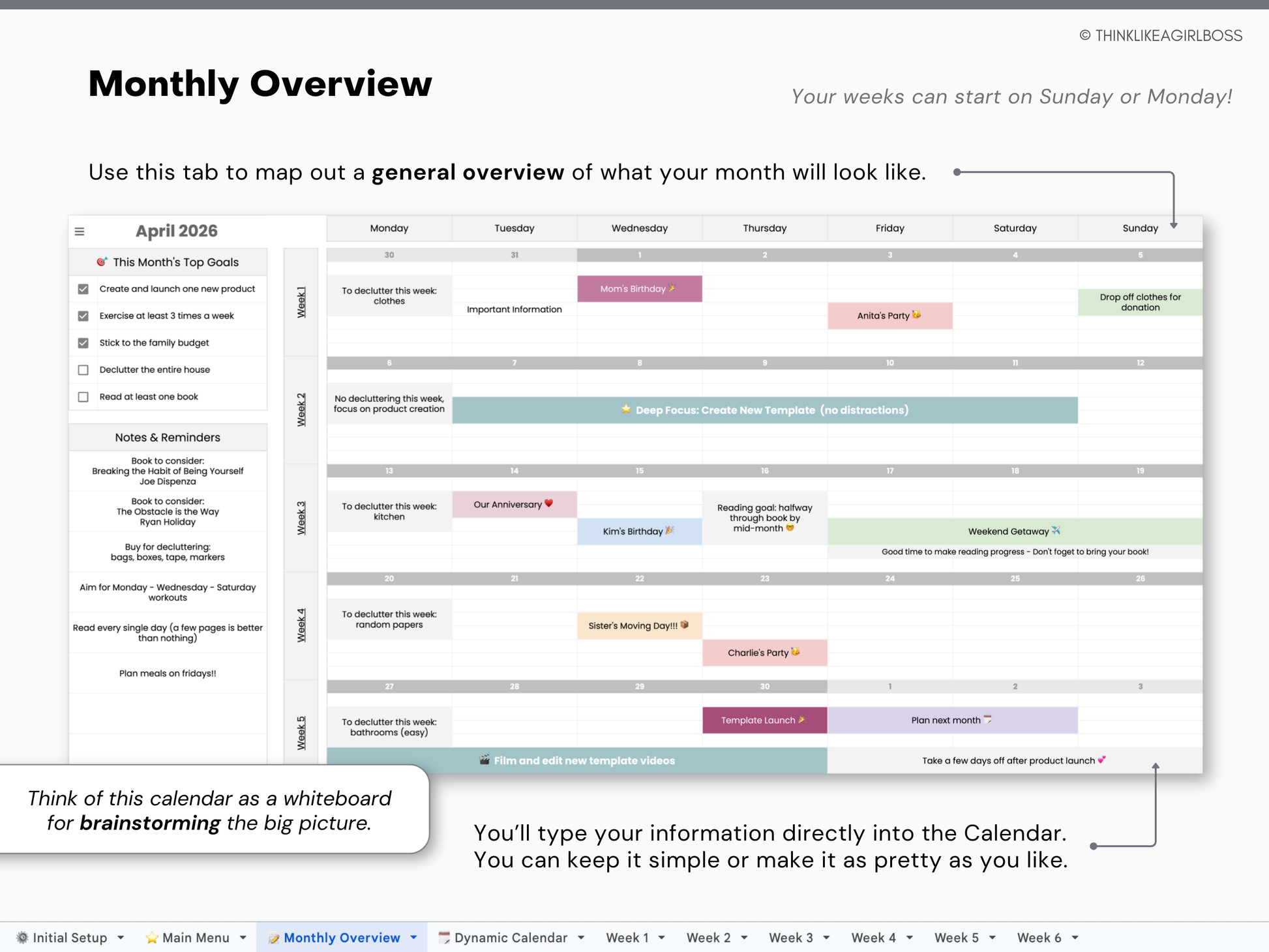 Step 2: Use the Monthly Overview and Dynamic Calendar tabs to plan an overview of your month by adding your top goals, key tasks, and important events.
