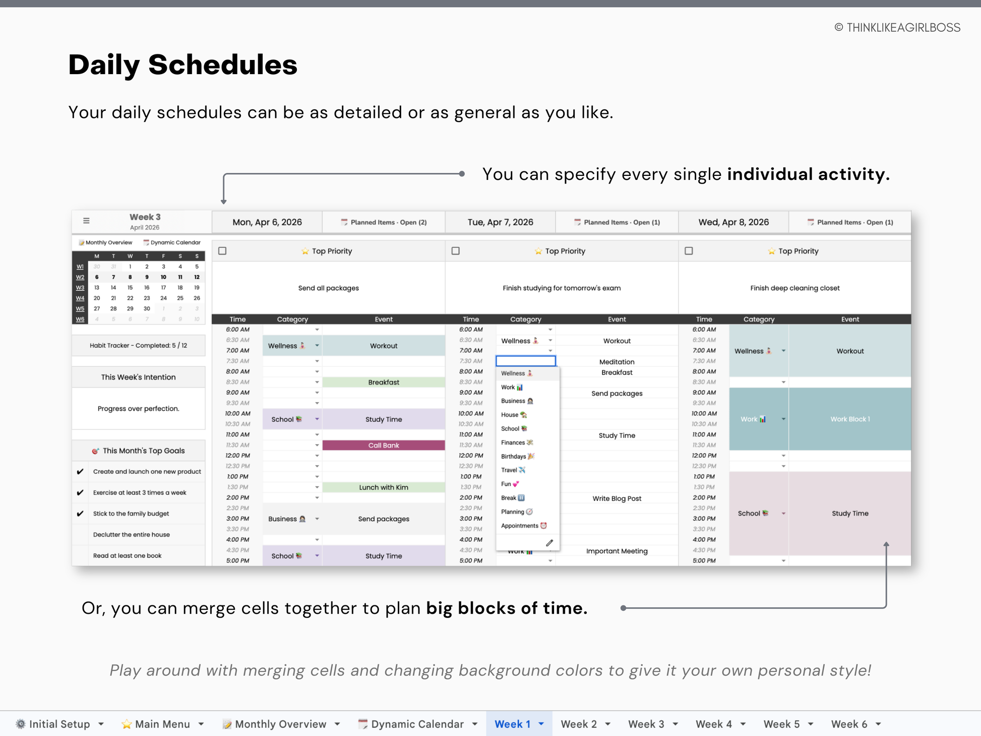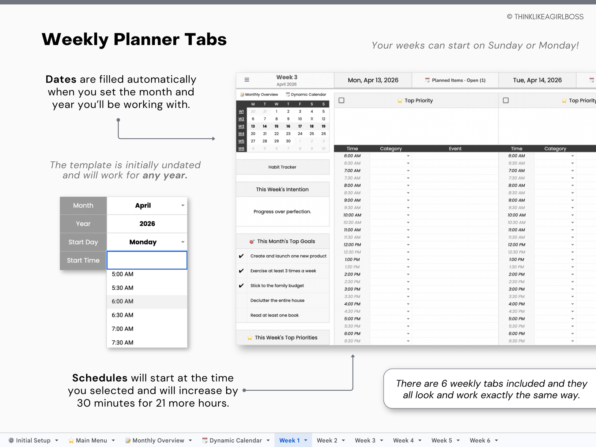 Step 3: Use the 6 Weekly tabs to plan your daily schedules, create daily to-do lists, keep track of your habits and more!