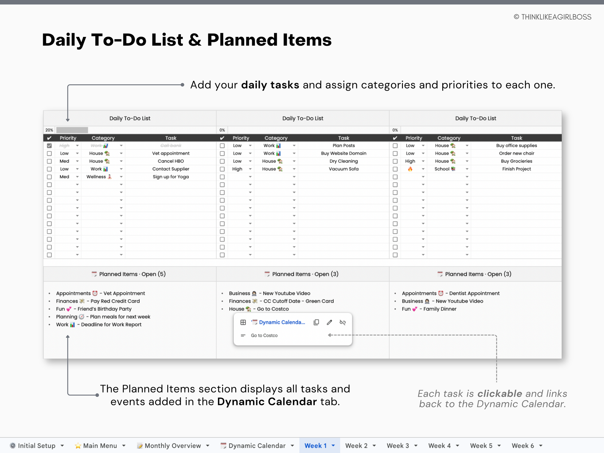 Plan tasks, events, and deadlines at the beginning of the month and have them sync with your weekly tabs.