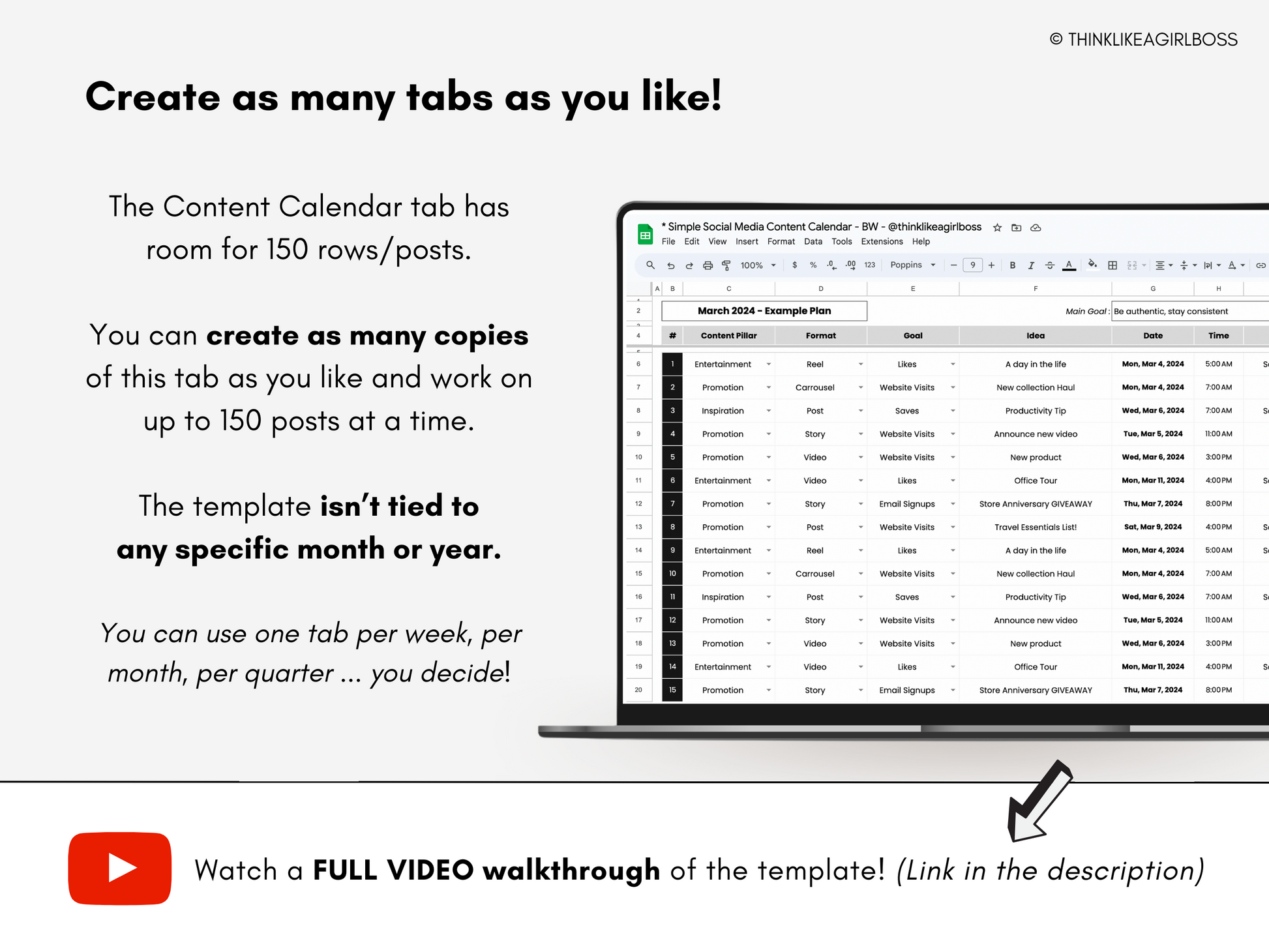 The tab has room for 150 rows. Create as many copies of this tab as you need. The template is undated and how often you use a new tab is totally up to you!