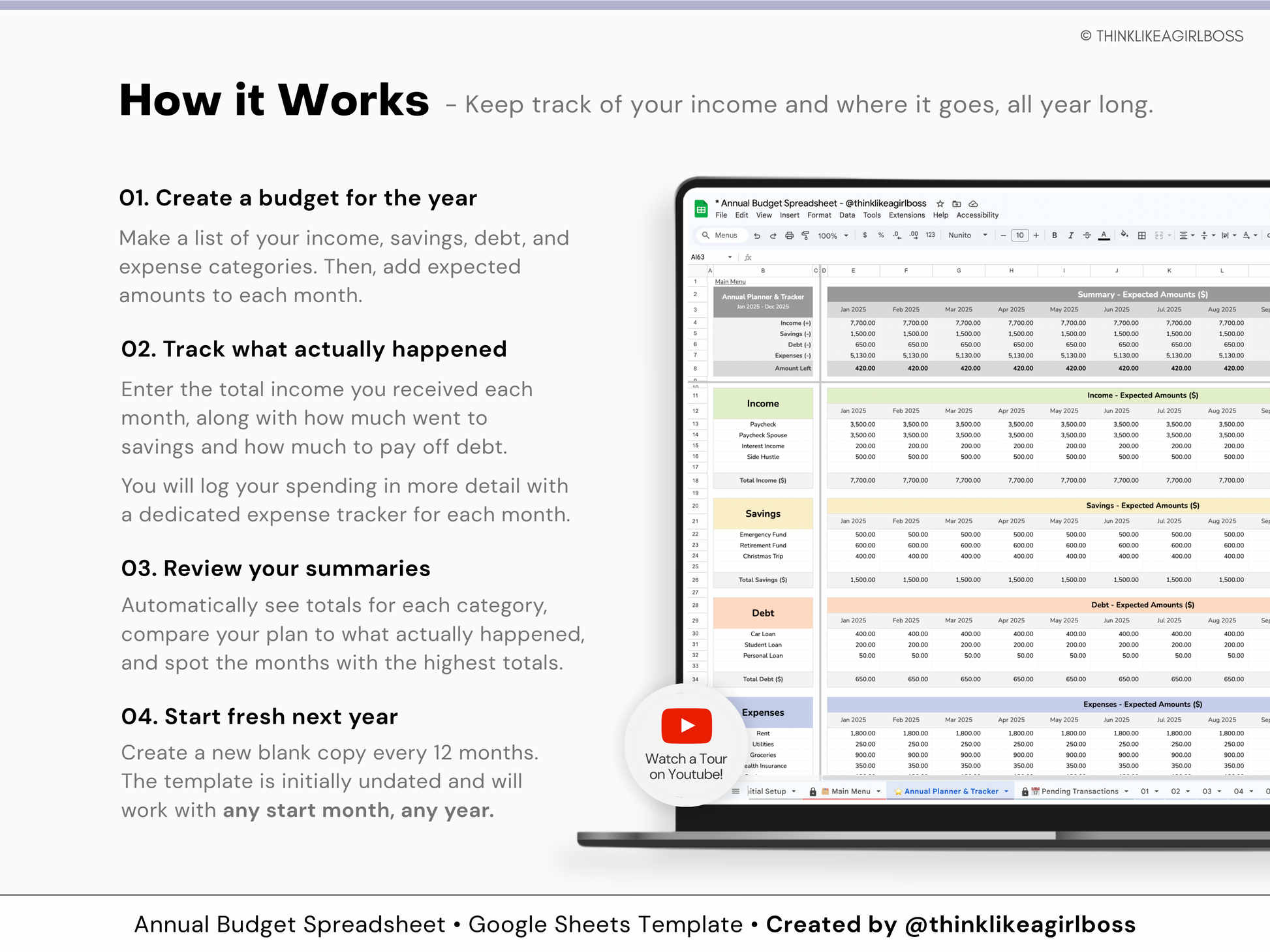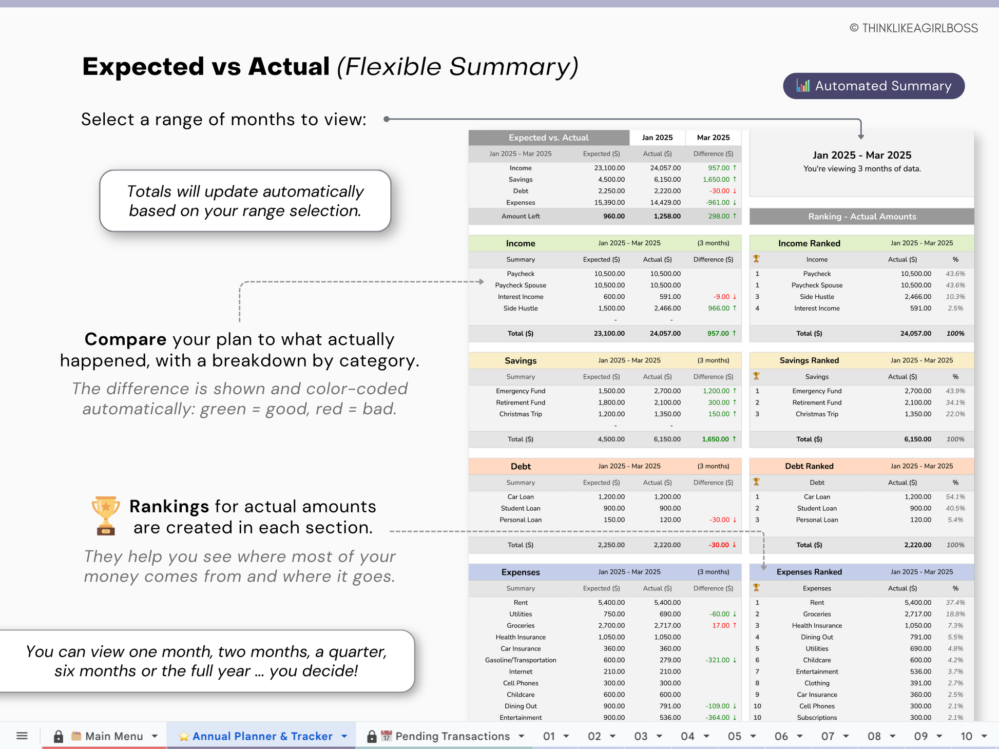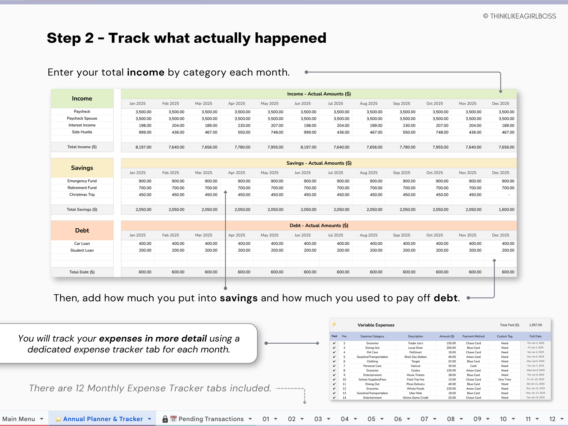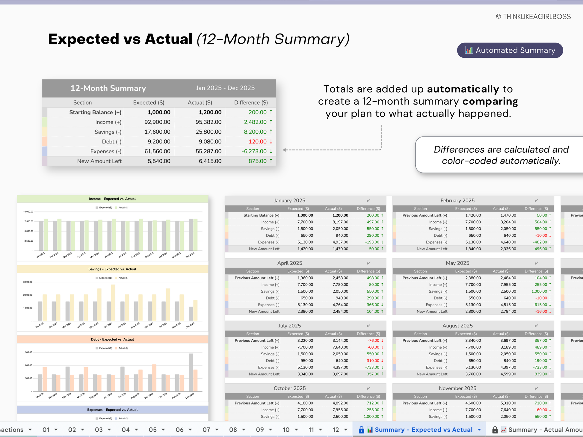 Customize your categories, plan your expected amounts, and log your actual income, savings, and debt each month.
