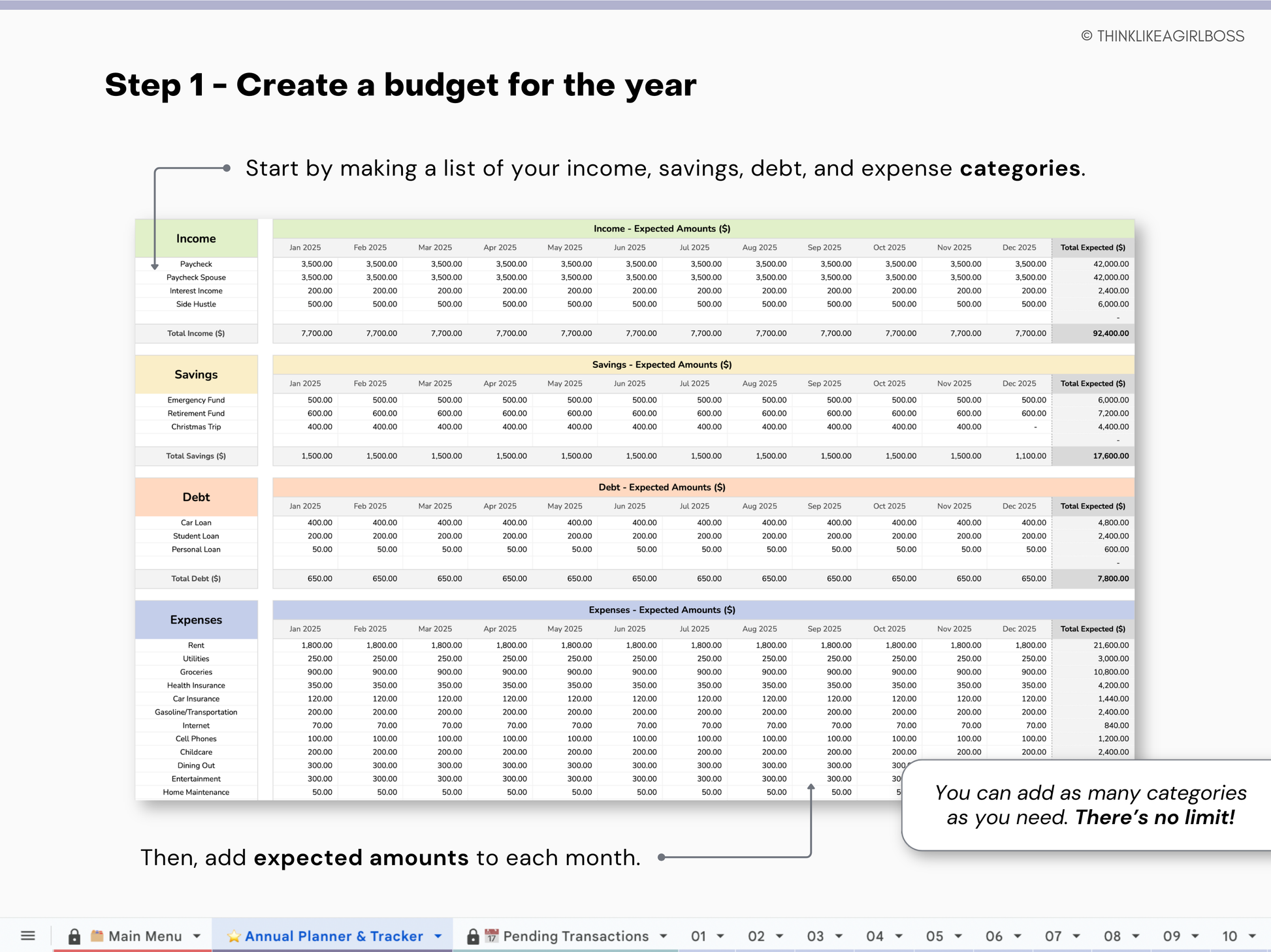 You will start by making a list of your income, savings, debt, and expense categories. Then, you will add expected amounts to each month.