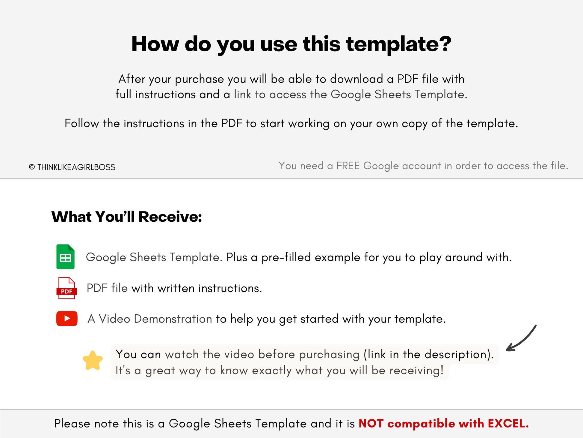 • Please note this template is NOT compatible with Excel, it can ONLY be used with Google Sheets.