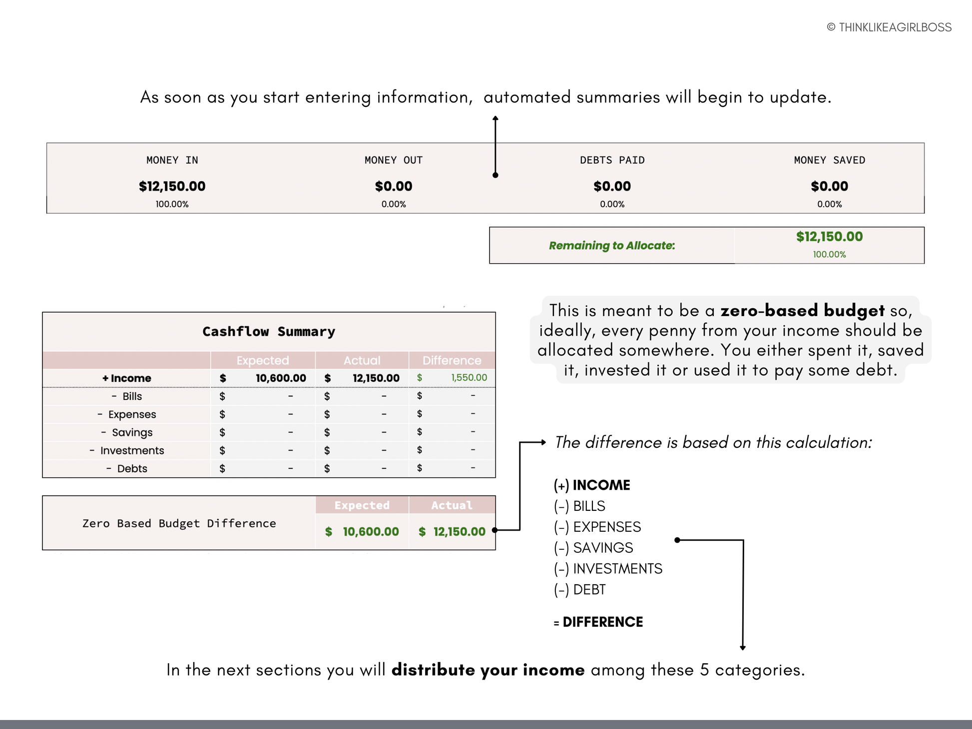 Step 2: Enter your expected income for the month and plan the way you will allocate it (savings, bills and expenses, debt payments, investments)