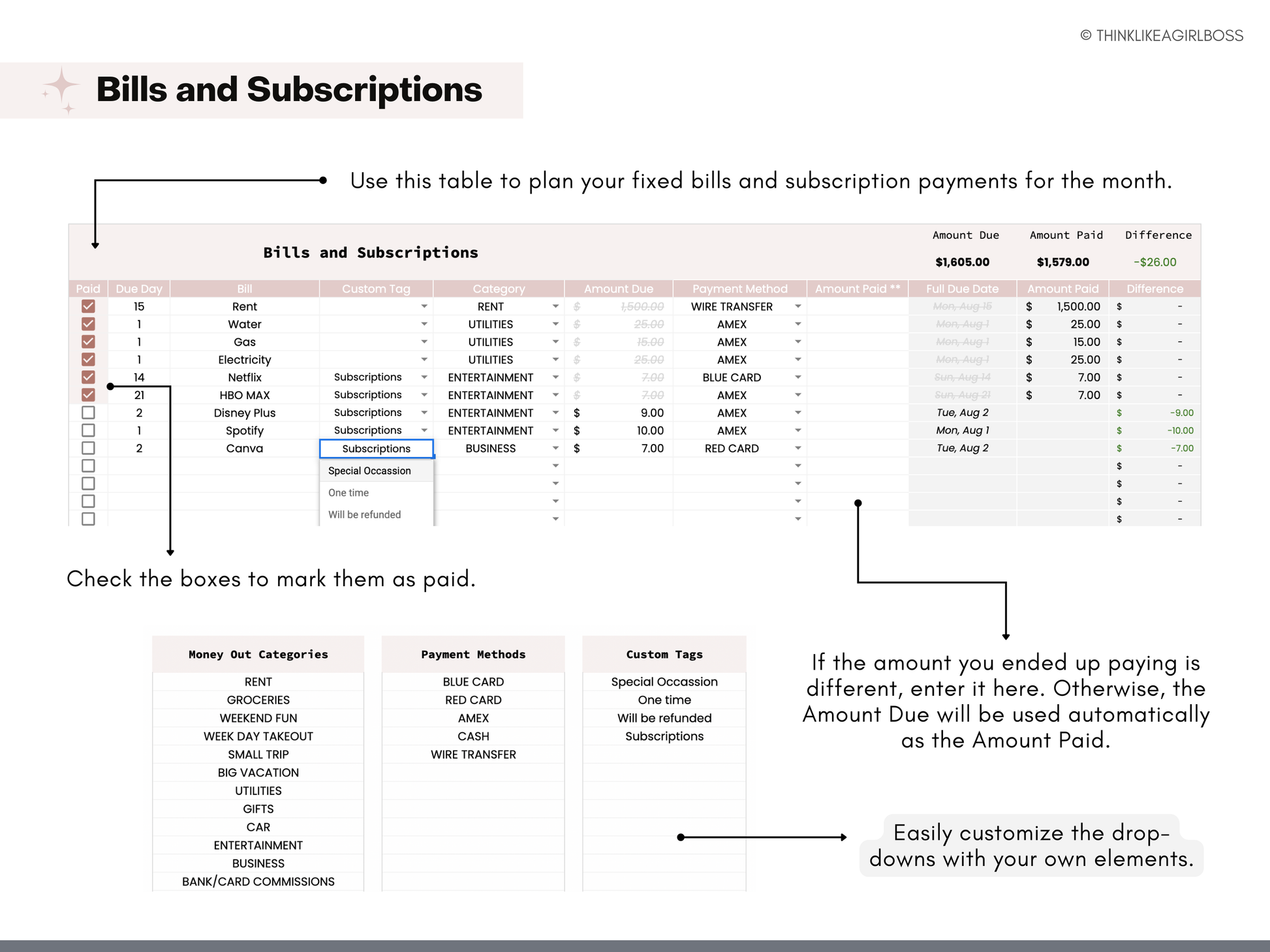 To start a new month just duplicate the tab or create a new copy of the file (instructions are included for both scenarios).